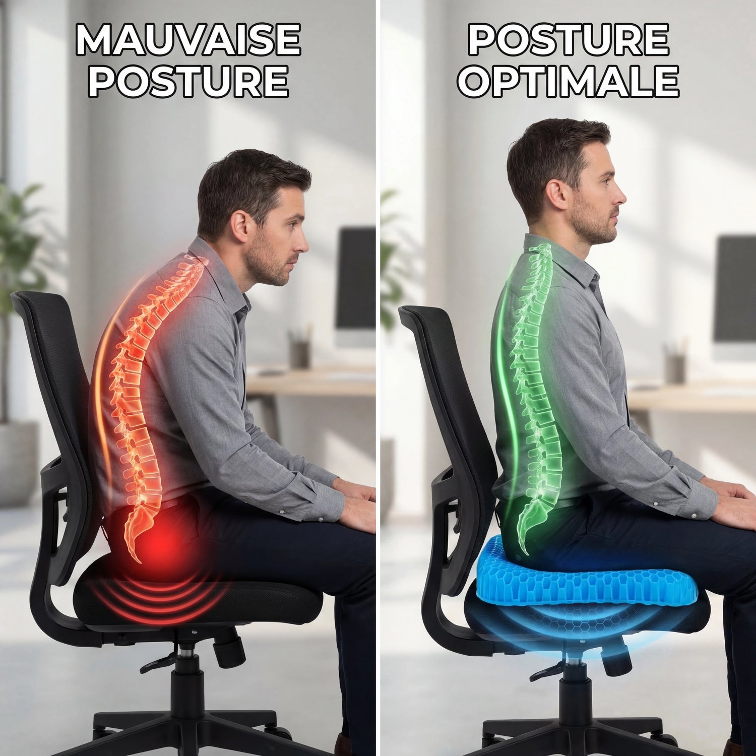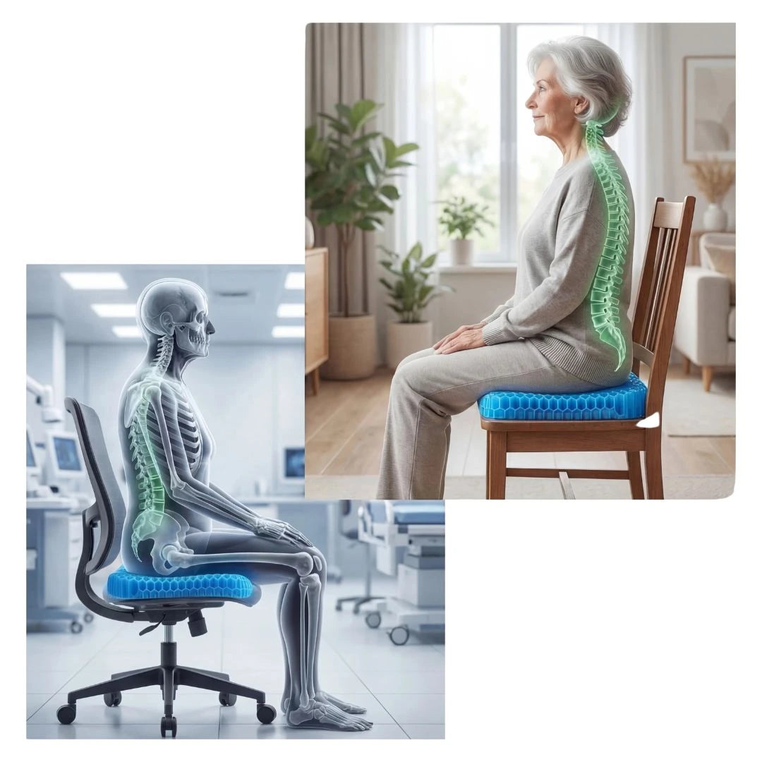 La plupart des chaises punissent votre corps en moins de 30 minutes. Vos hanches basculent, votre colonne s'affaisse, et la pression écrase votre coccyx et votre nerf sciatique.C'est pourquoi les longs trajets, les journées de travail, ou même un repas peuvent vous laisser endolori, raide ou engourdi.